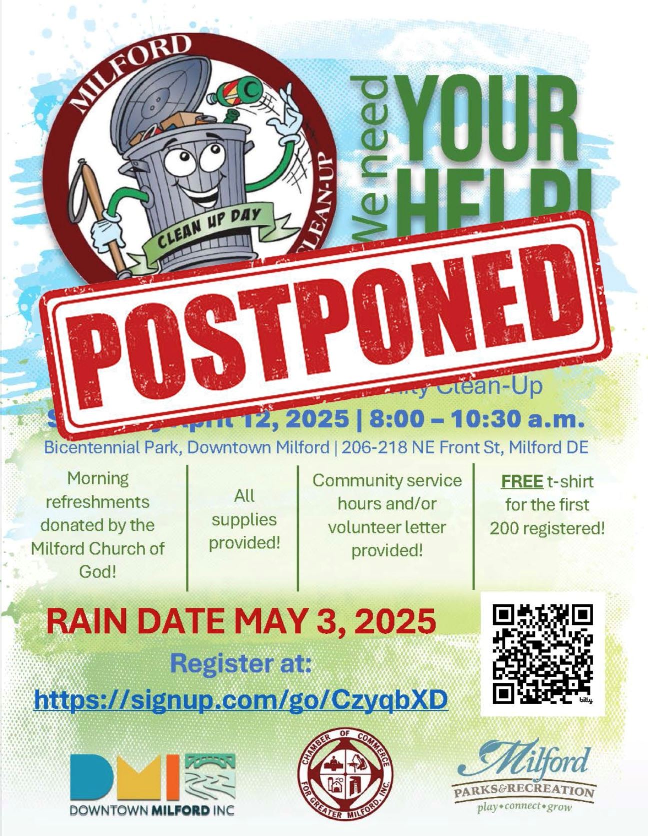The 5th Annual Community Clean-Up has been rescheduled to Saturday, May 3, 2025 due to the inclement weather anticipated for tomorrow morning.