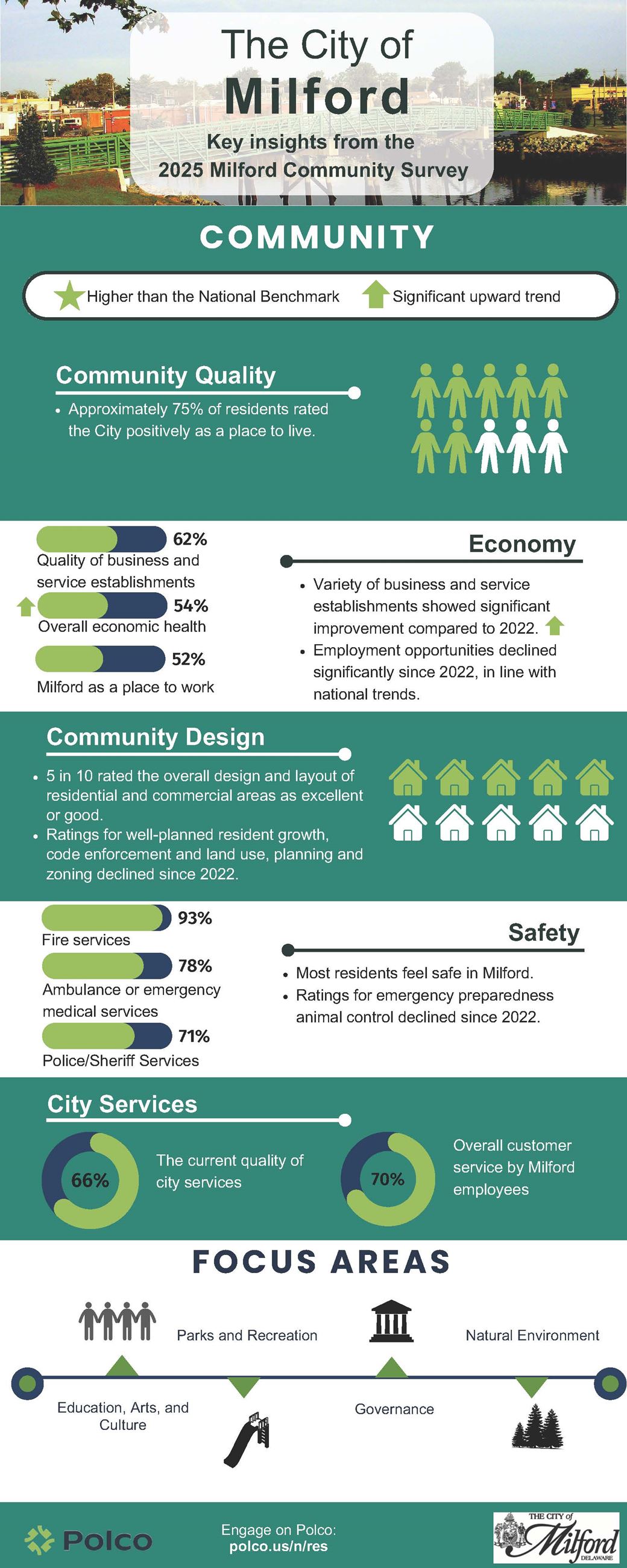 In January 2025, the City of Milford partnered with Polco to conduct the National Citizen Survey (NCS). We reached out to 3,000 randomly selected households and opened the survey to all residents online.