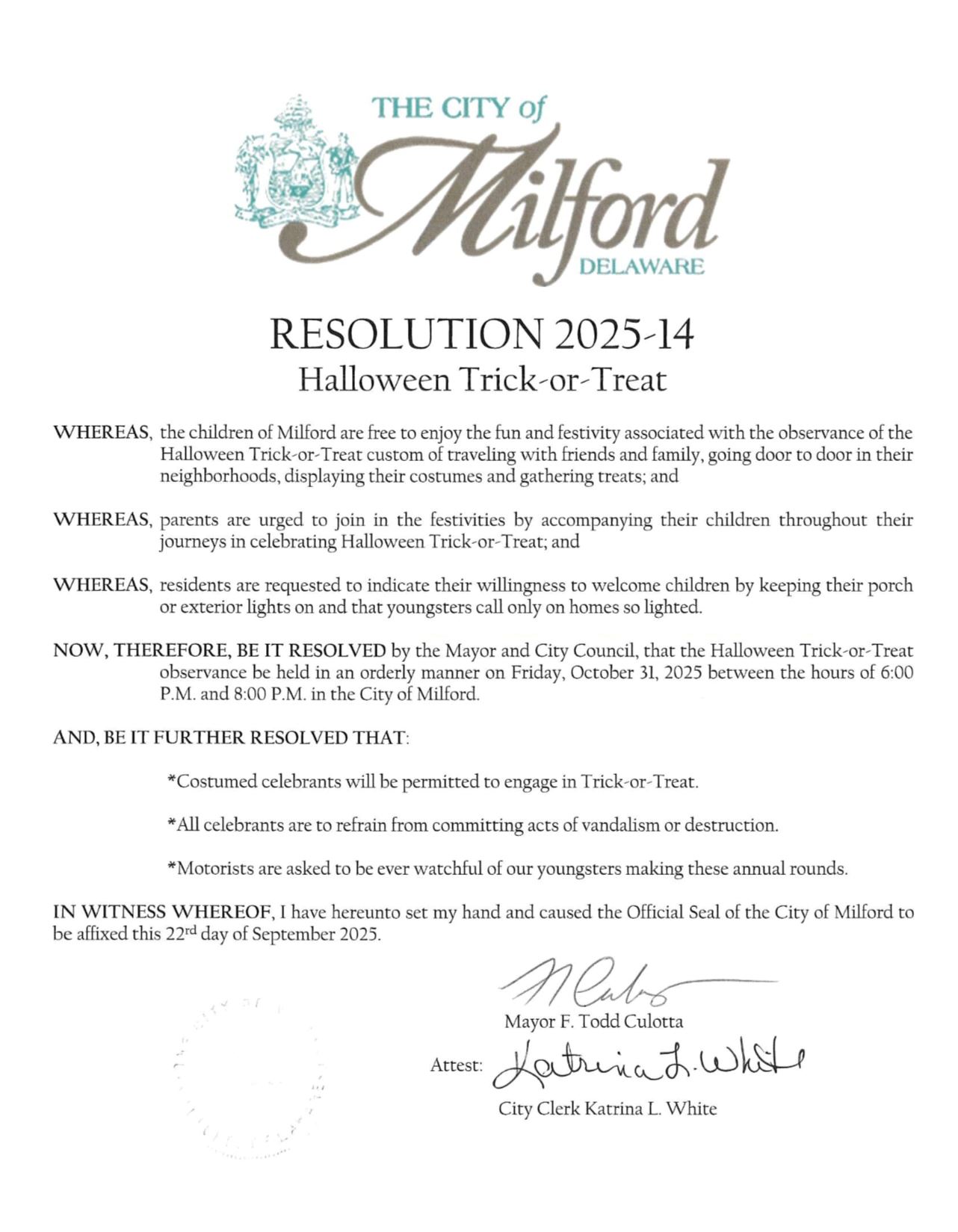 Get your costumes ready! The City of Milford will observe Halloween Trick-or-Treat on Friday, October 31st from 6:00 PM to 8:00 PM.